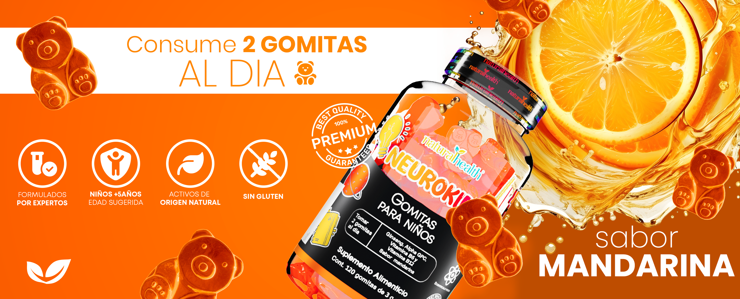 🧸120 gomitas sabor mandarina de 3 gramos cada una. Rinden para 2 meses de uso.