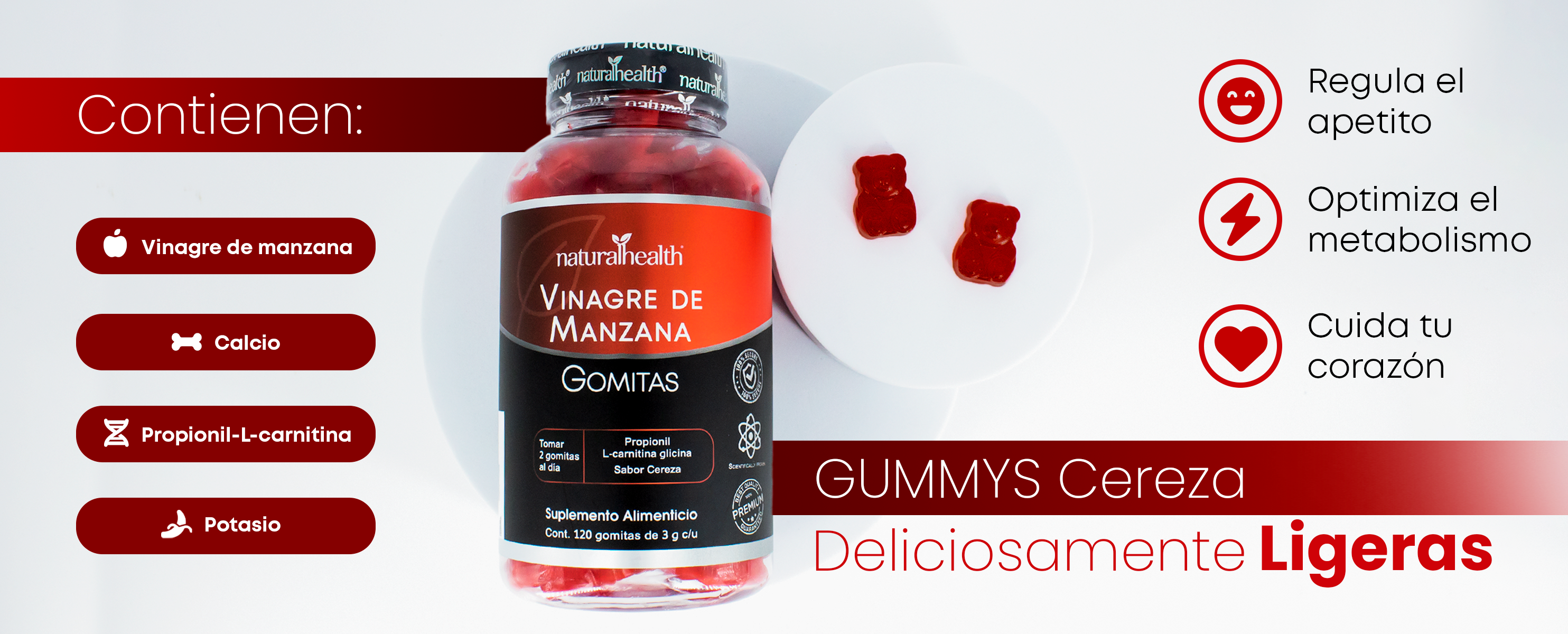 Vinagre de Manzana en Gomitas | L-Carnitina Glicina + Calcio y Potasio | 120 gomitas | Sabor cereza